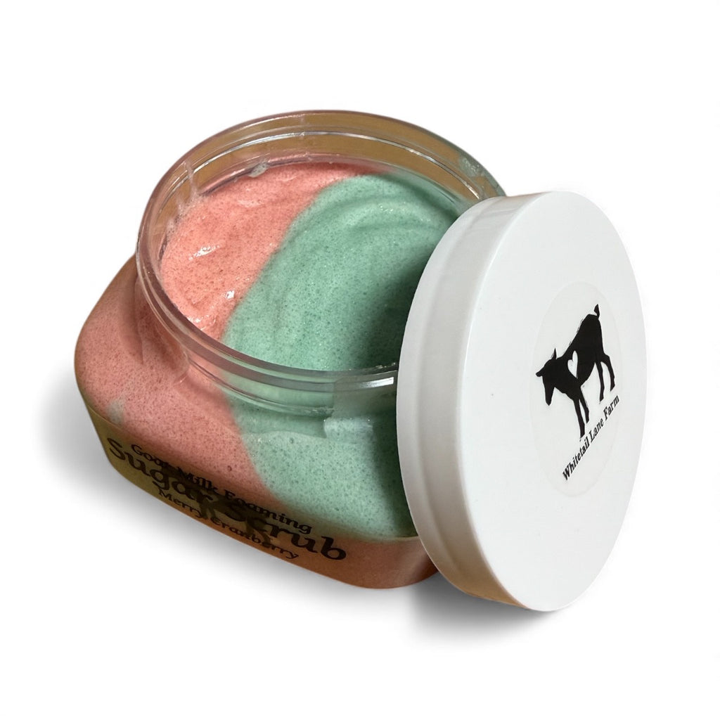 Want something extra special to pamper your skin? Our Merry Cranberry Goat Milk Sugar Scrub Foaming Bath Whipped Sugar Scrubs gently detoxifies that leaves your skin feeling soft and moisturized! It gently removes dry, flaky skin cells and brightens tired, dull looking skin to promote smooth, healthy and flawless skin because it contains natural Goat milk that is enriched with high amounts of protein, fat, iron, Vitamin A, B6, B12, C, D, E and many more; it will help retain skin moisture, making this whipped body scrub ideal for delicate and sensitive skin.